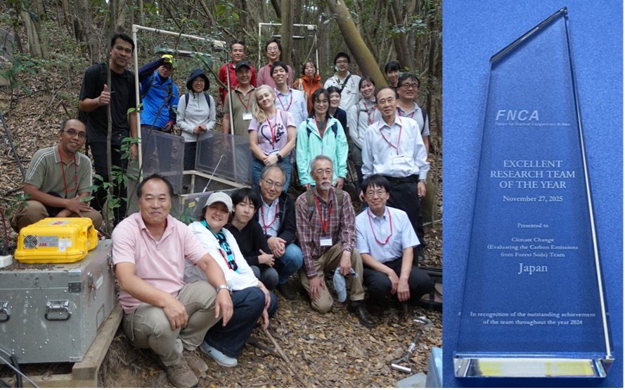 環境動態研究グループを中心とし、国立環境研究所、東京大学、森林総合研究所、千葉大学、新潟大学と連携した研究チームは、令和7年11月27日に開催されたアジア原子力協力フォーラム(FNCA)の大臣級会合において、原子力及び同位体技術を活用した気候変動研究の業績により、FNCA優秀研究チーム賞を受賞しました。