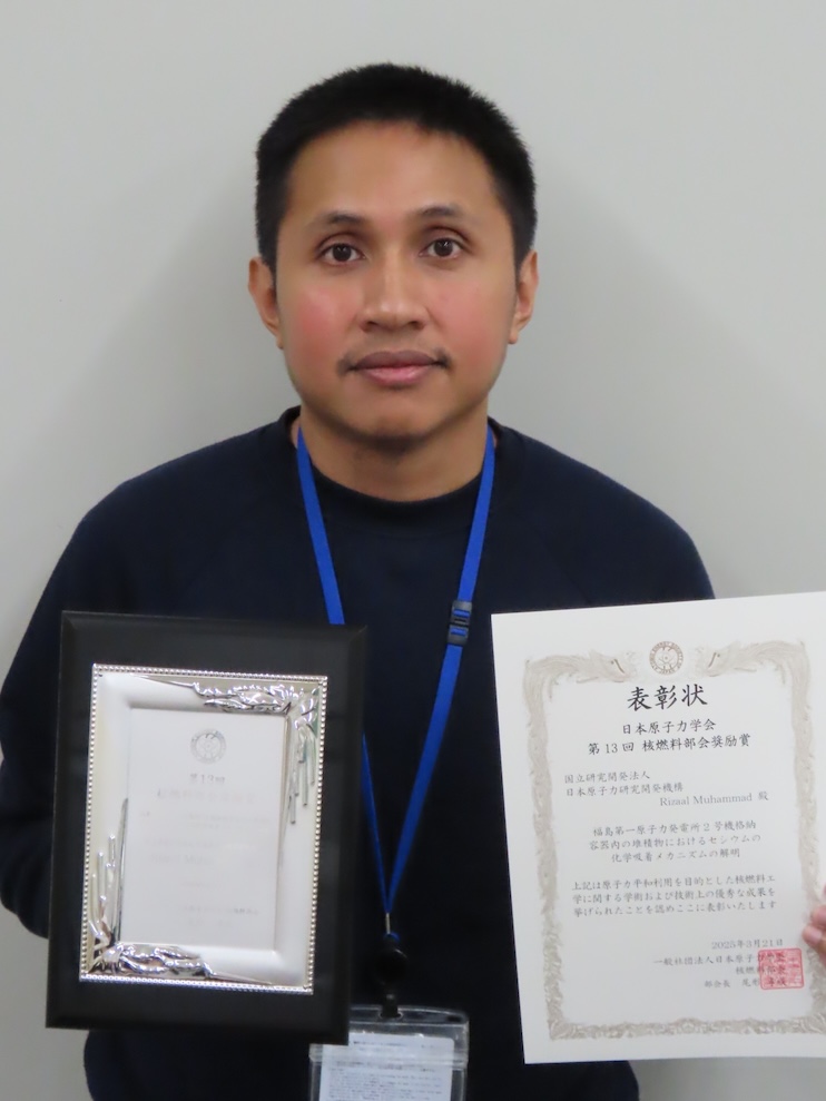 燃料高温科学研究グループの リザールムハンマド 研究員が、第13回日本原子力学会核燃料部会部会賞において奨励賞を受賞しました。この受賞は、核燃料・材料分野への貢献が評価された若手研究者に授与されるもので、受賞対象となった成果は「福島第一原子力発電所2号機格納容器内の堆積物におけるセシウムの化学吸着メカニズムの解明」です。