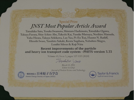 放射線挙動解析研究グループの佐藤達彦研究フェローらは、日本原子力学会英文誌 Journal of Nuclear Science and Technology に掲載された論文「Recent improvements of the particle and heavy ion transport code system–PHITS version 3.33」(J. Nucl. Sci. Technol., Vol. 61, No. 1, pp. 127-135, 2024)により、2026年3月12日にJNST Most Popular Article Awardを受賞しました。